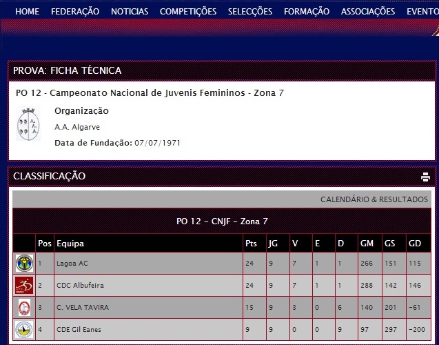 · Assim a classificação do PO12 -Campeonato Nacional de Juvenis Femininos, Zona 7, terá de ser alterada em conformidade com o aqui explanado. Ou seja O C.D.C.A. estará certamente em primeiro lugar, devido ao estipulado no critério de desempate da alinea c), já que em nosso entender não pode aplicar-se o estipulado na aliena b) do artigo 13º.